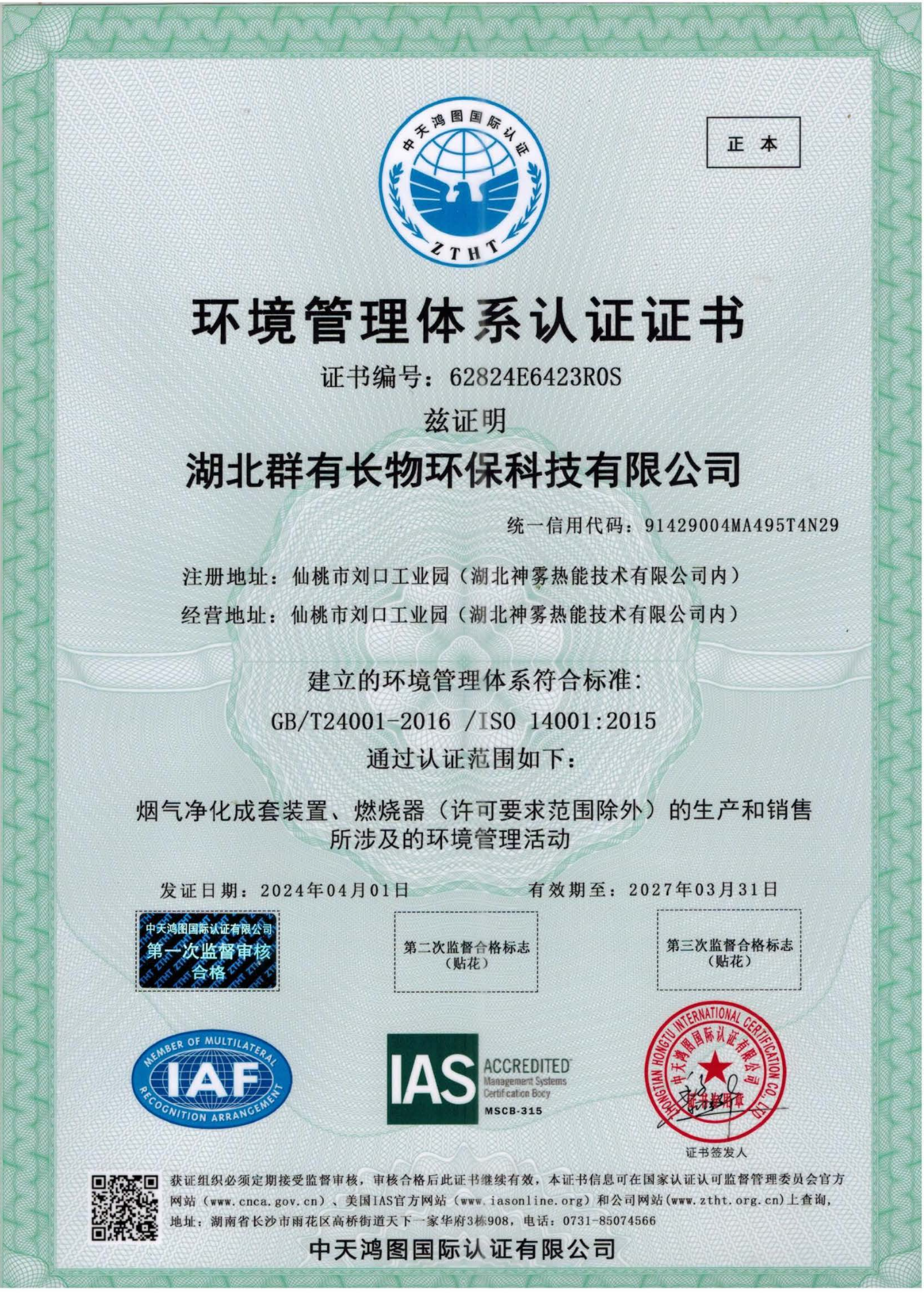 环境管理体系认证证书